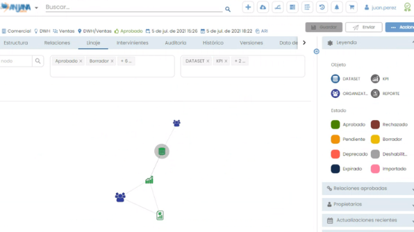 El linaje extendido ofrece trazabilidad end-to-end tanto en dimensión vertical (técnico→negocio) como horizontal (origen→consumo), con múltiples capas visuales configurables por perfil de usuario. Esta visión sustenta el control de impactos proactivo: antes de propagar cambios, se identifican dependencias, se evalúan relaciones y se comunican afectaciones para tomar decisiones informadas. La plataforma incorpora detección automática de impactos, versionado avanzado, gestión de expiraciones y comparativa de objetos para prevenir degradaciones y mitigar errores no aprobados.