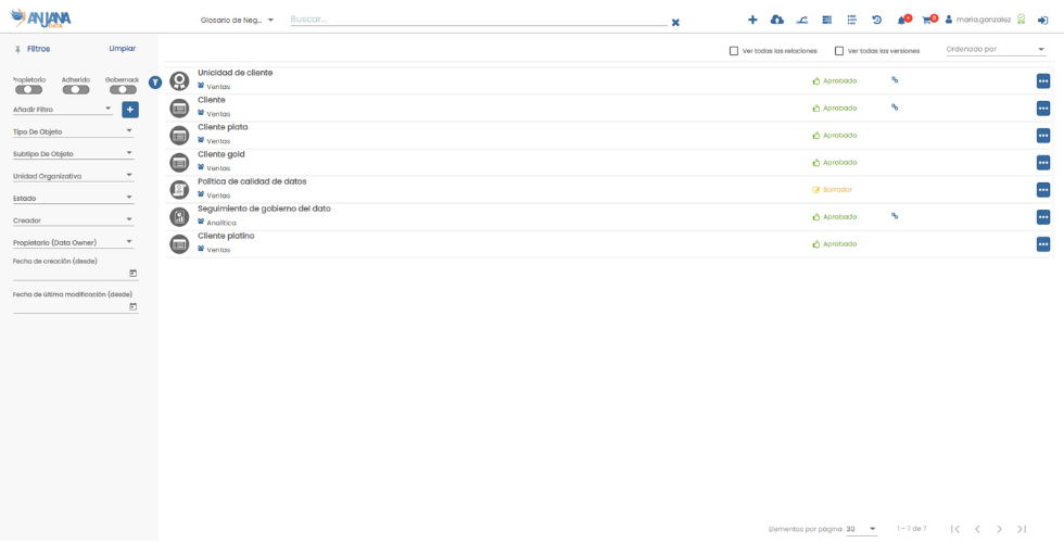El Glosario de Negocio actúa como capa semántica superior, sincronizada con el metamodelo global, para describir conceptos, entidades y relaciones desde la perspectiva de negocio, con atributos flexibles y navegación bidireccional con el catálogo. Opera en un entorno colaborativo multi-idioma, personalizable por usuario, y facilita búsquedas semánticas y acceso contextuado al conocimiento organizativo.