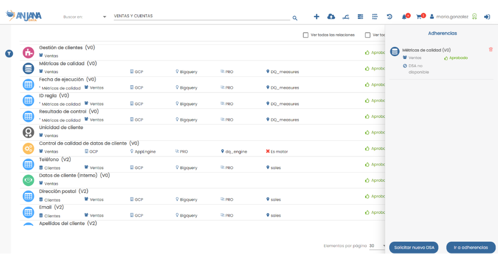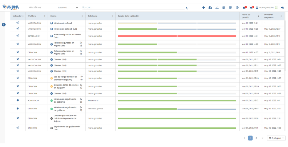 Todos los repositorios internos de Anjana Data son abiertos y documentados, lo que permite conectar herramientas de BI/Analytics para monitorizar la adopción del modelo de gobierno, el rendimiento de procesos, el estado de calidad y cumplimiento, o el grado de reutilización de activos. Esto habilita KPIs y SLAs de gobernanza y acelera la mejora continua con evidencia cuantitativa.