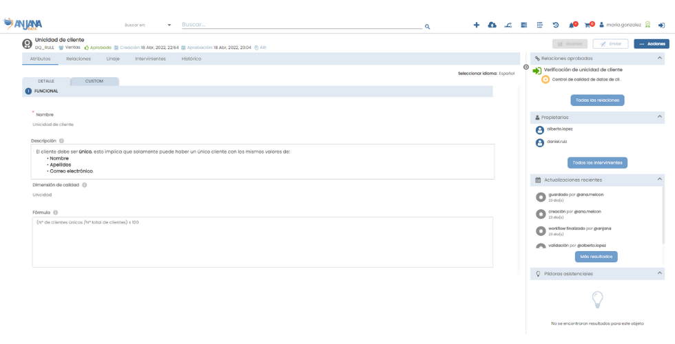 La plataforma gestiona reglas y controles de calidad de forma abierta y customizable, integrándose con motores de calidad de terceros para la ejecución. Permite definir métricas asociadas a activos y consolidar resultados con distintos niveles de granularidad para análisis, monitorización, alertas y seguimiento de acciones preventivas/correctivas, posicionando a Anjana Data como capa supervisora de la calidad en el marco de gobierno.